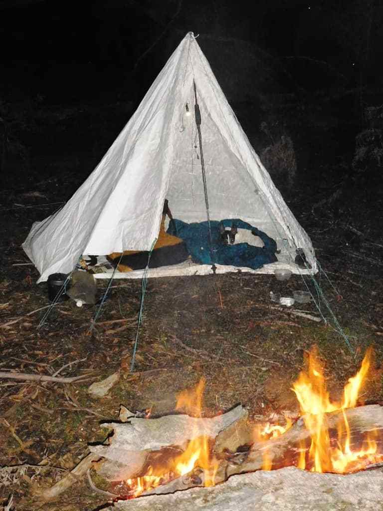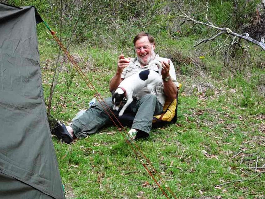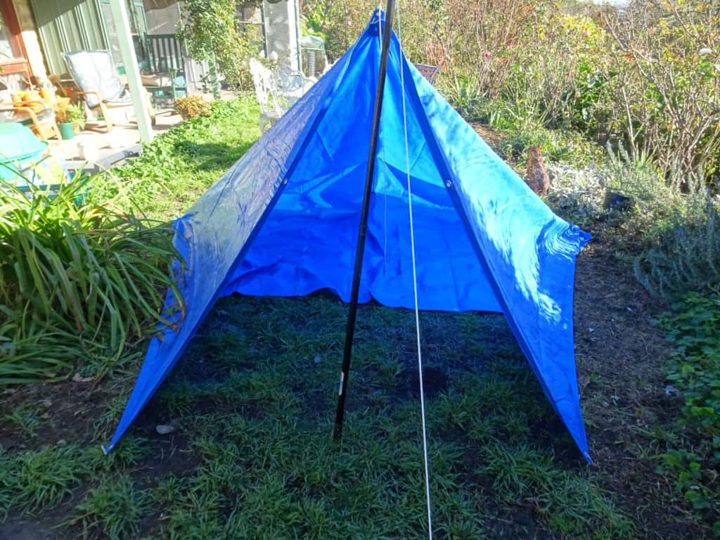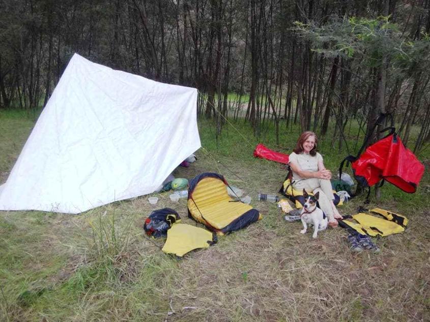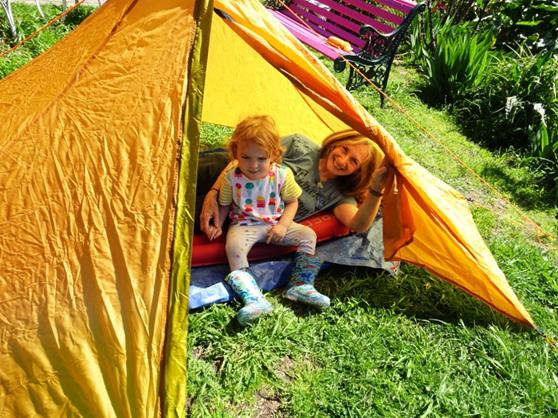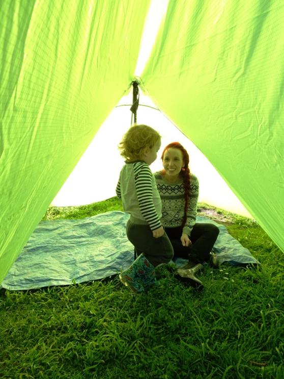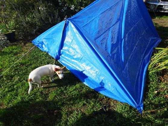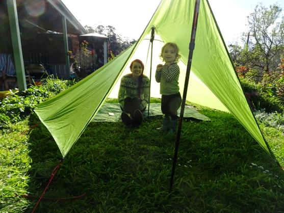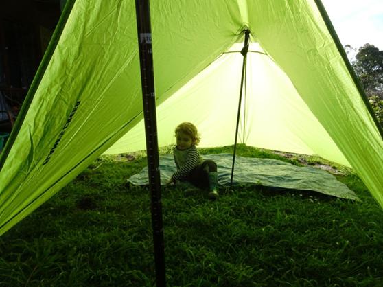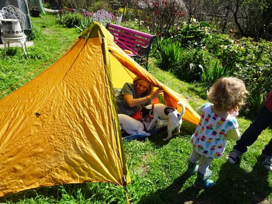 A very hastily erected tent. I tautened it up a little bit later. I like how it caught the light of the westering sun. Della is 'intent' on her ebook.