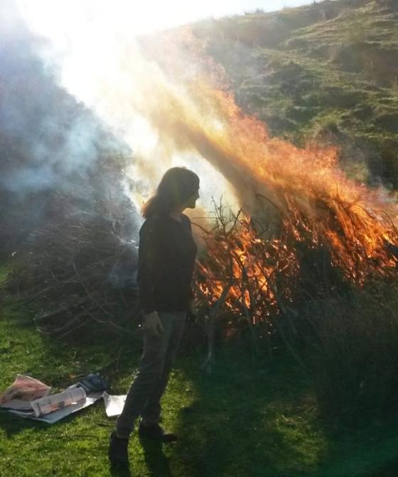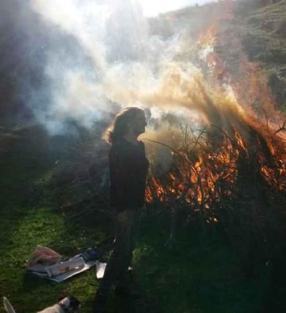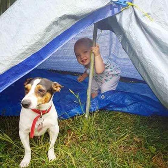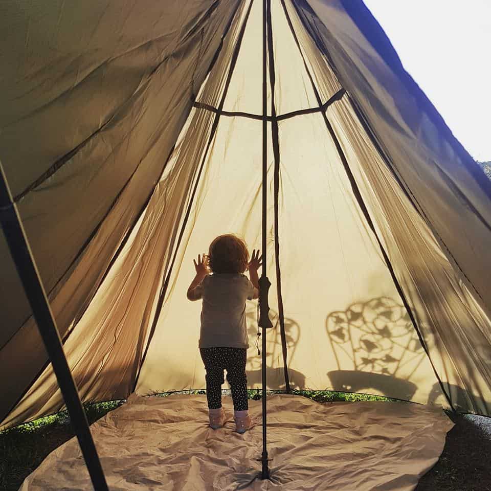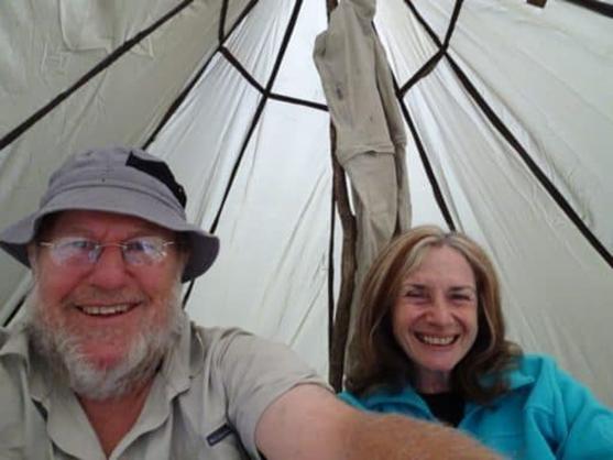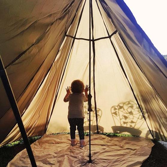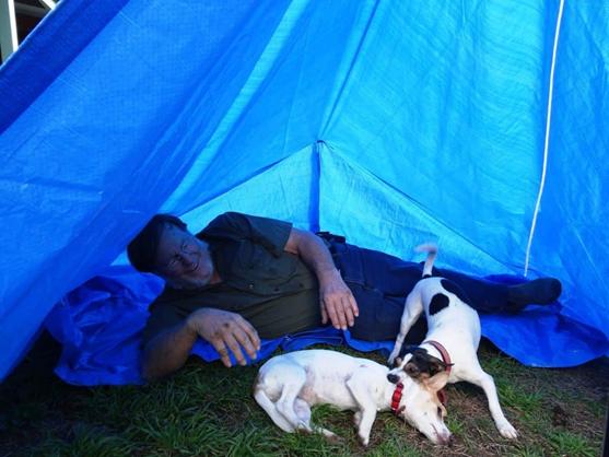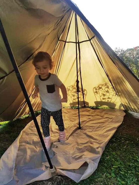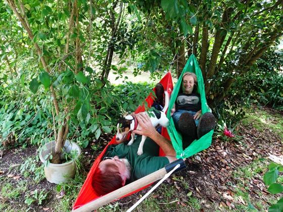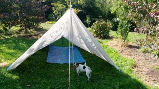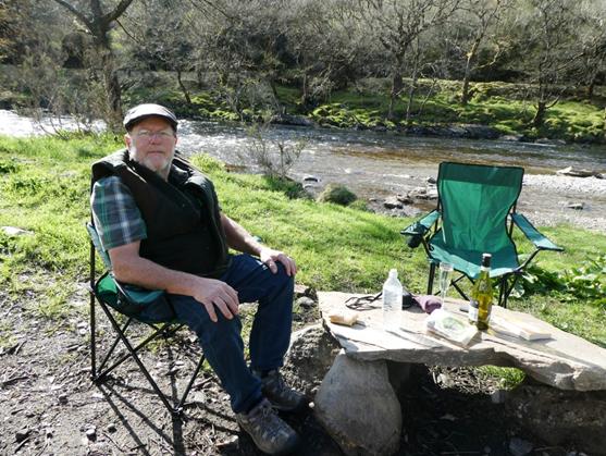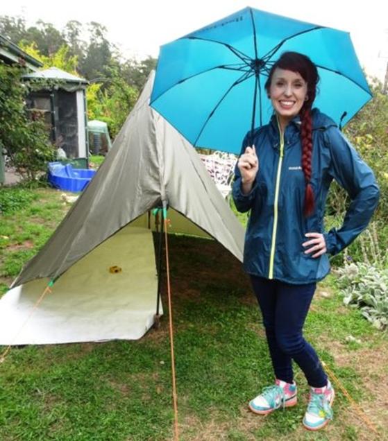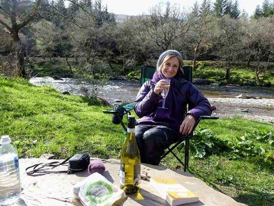 A very hastily erected tent. I tautened it up a little bit later. I like how it caught the light of the westering sun. Della is 'intent' on her ebook.