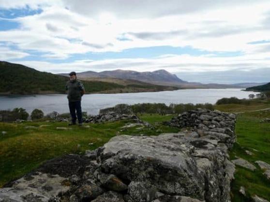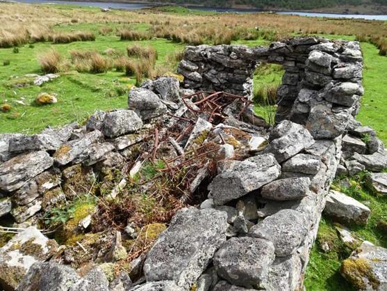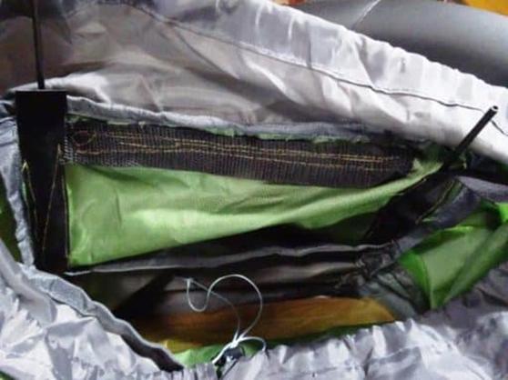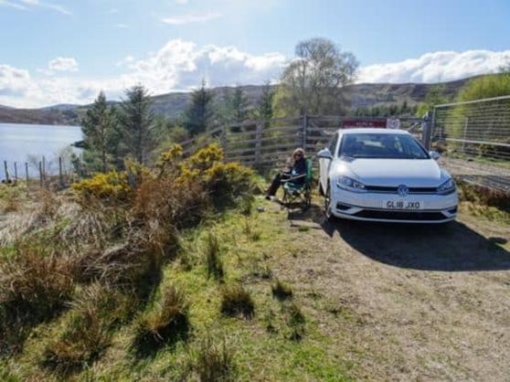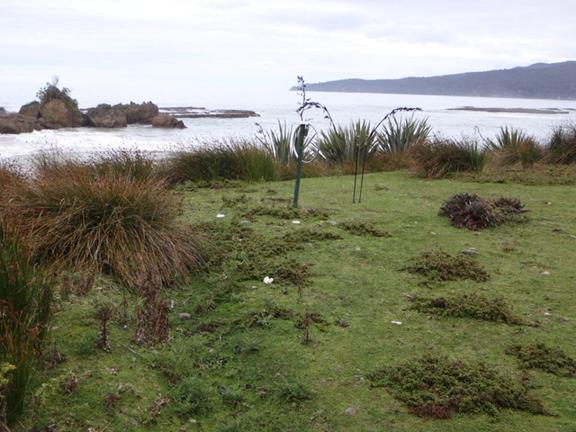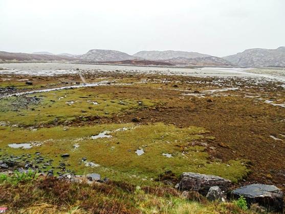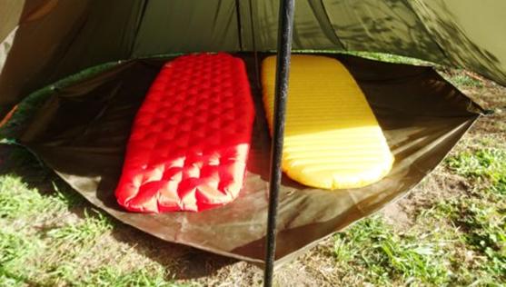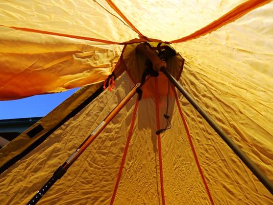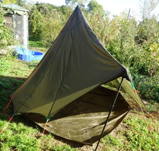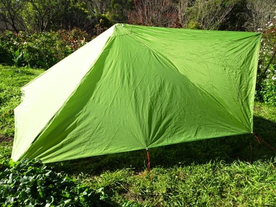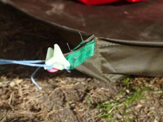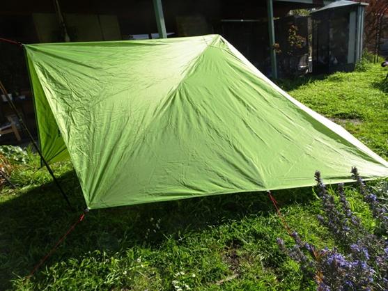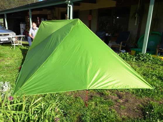 It is a fine grassy flat. This is a photo of the tent in the morning. When I erected it, I just went around and pushed all the pegs in and placed the poles in their pockets. That's it. No adjustment. There was a wind in the night (and a light shower) but this is what the tent still looked like in the morning; taut as. It still looks pretty much the same when I remove all but four of the pegs! As I say, I like a tent which goes up easily but does not come down the same way! It is also really nice to be able to stand up inside and get dressed too.